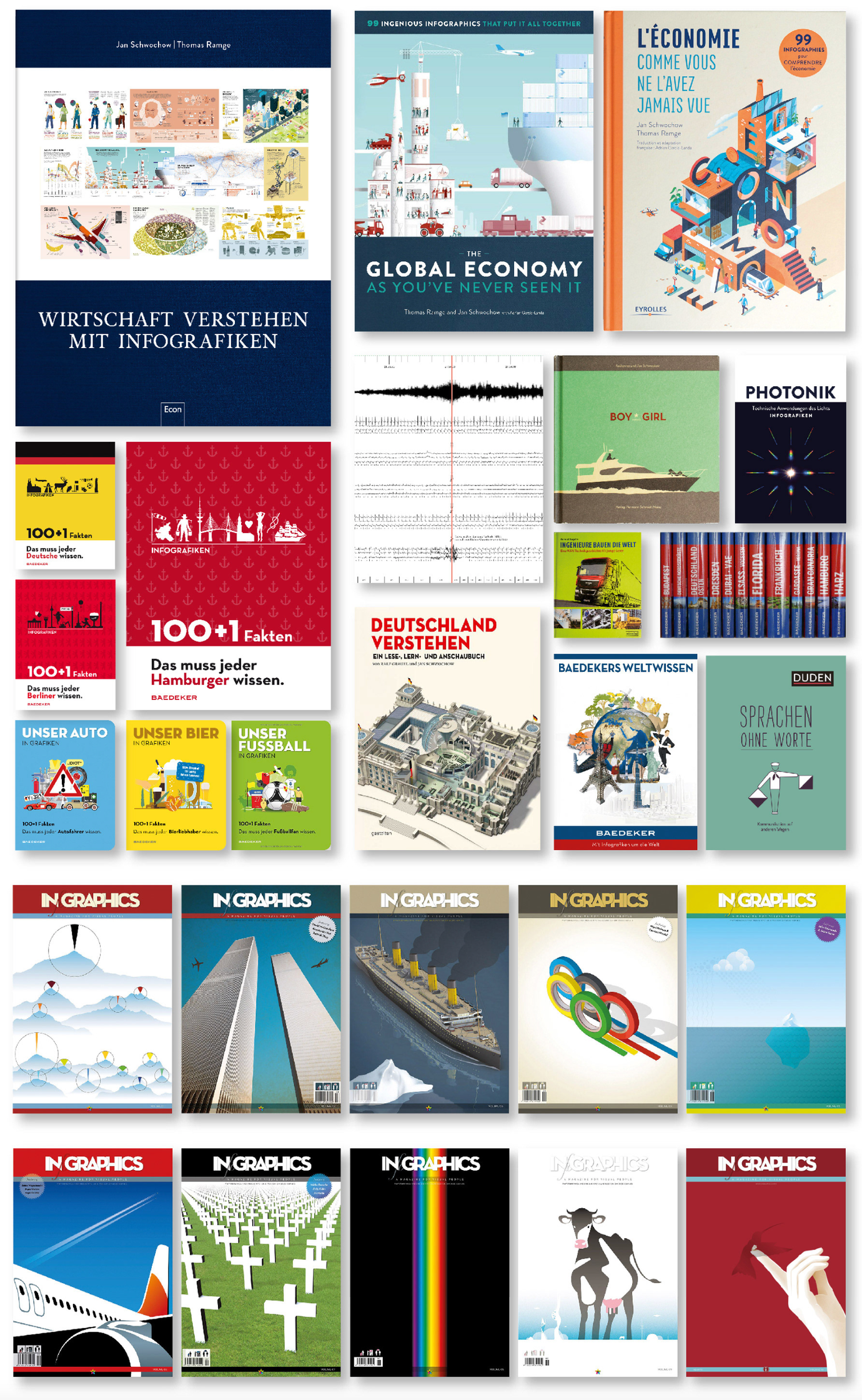 u. a. Grafik, Infografik, Layout, Titelgestaltung, Recherche, Bildbearbeitung, Kundenbetreuung in Teamarbeit bei diesen Publikationen (entstanden bei Golden Section Graphics & der Infographics Group)