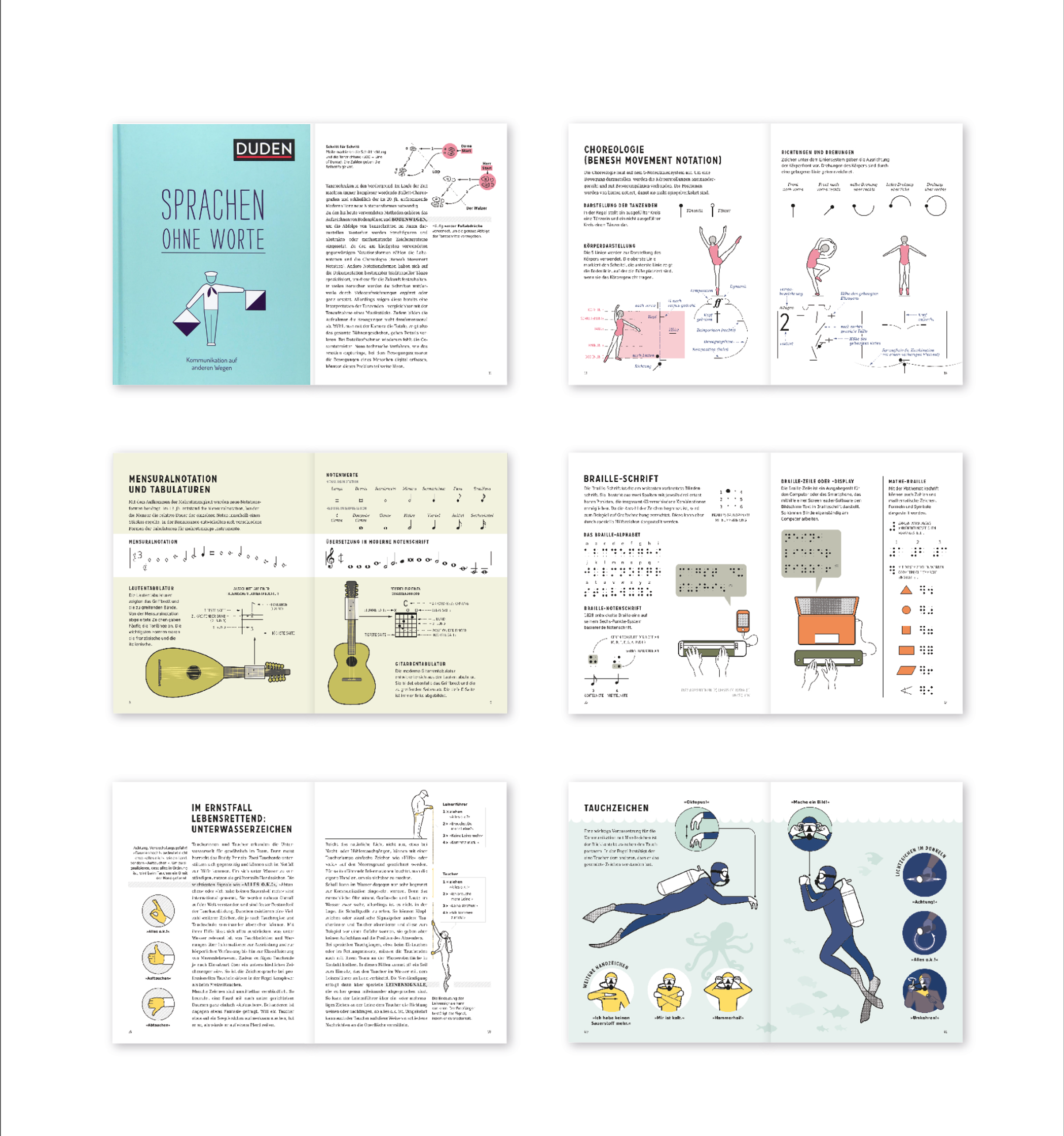 "Sprachen ohne Worte" Duden Verlag, Covergestaltung, Layout, Grafik, Titelidee, entstanden bei der Infographics Group, Zusammenarbeit mit Katja Günther (Grafik), Andrea Weller-Essers (Text & Redaktion) und Dr. Kathrin Kunkel-Razum (Redaktionelle Leitung Duden)